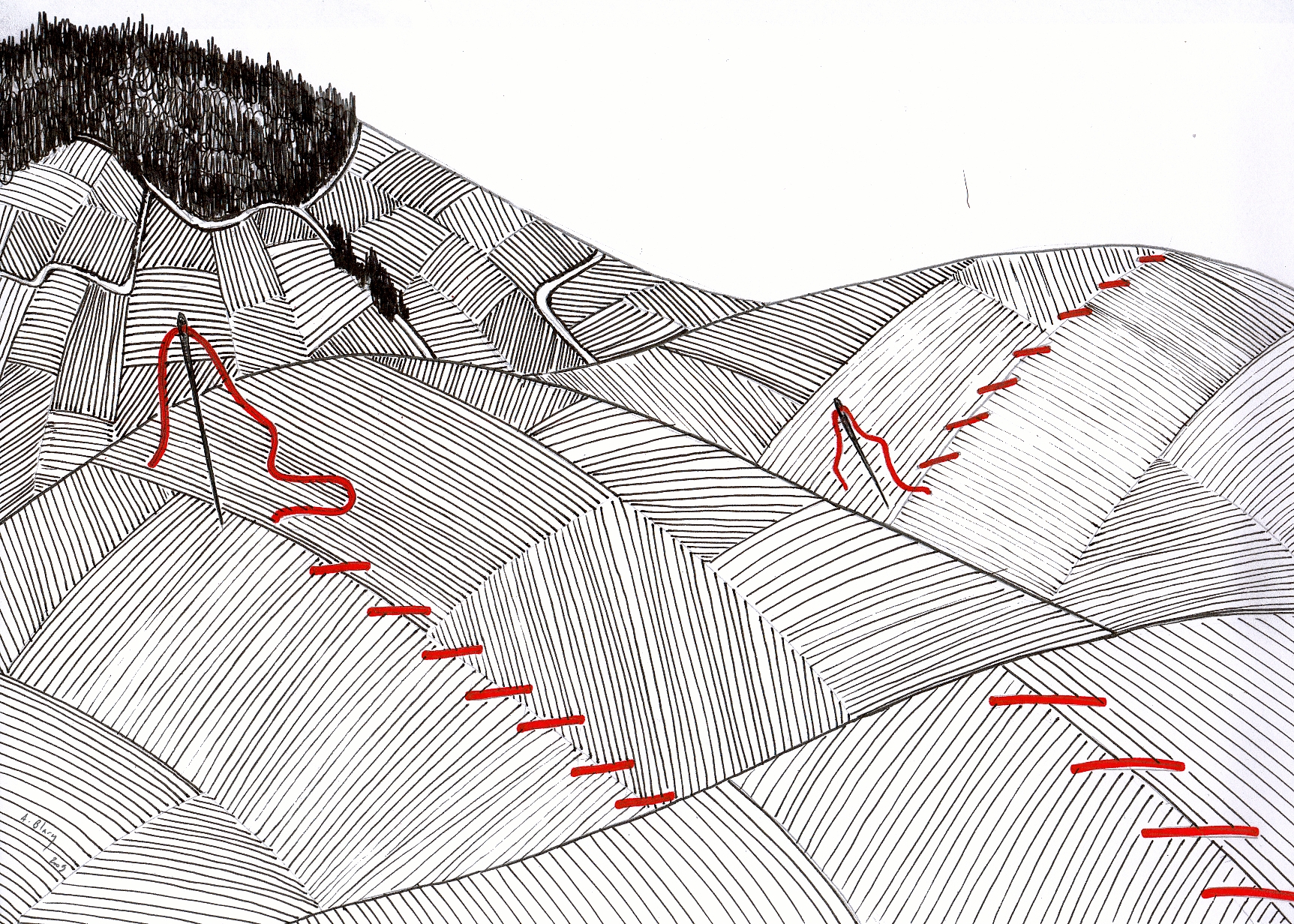 Les Aiguilles interrogent, par leur dimension, la notion même d’impact, d’empreinte laissée par l’activité humaine sur le tissu terrestre. Métaphoriquement, l’espace « cousu » devient une peau vivante, fragile, diluant ou accusant la réalité du territoire et le concept de frontière.