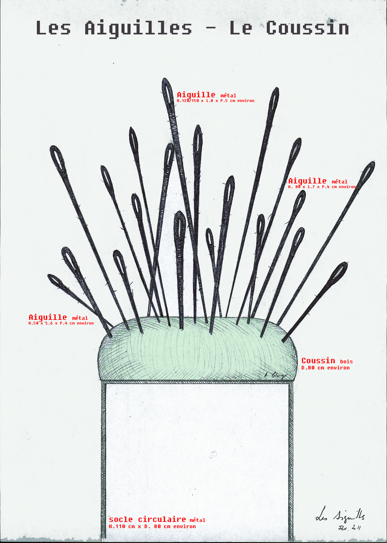 J’ai reçu en 2010 pour ce projet le soutien de la Ville de Reims qui me donne la possibilité de créer, en préfiguration de l’oeuvre monumentale définitive, un coussin à aiguilles géant.